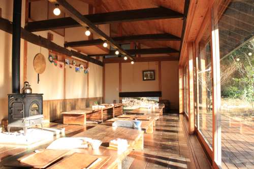 ガラスの窓からは木々が繁る庭を見渡すことができ、自然の中にいるような気持ちで食事ができます。「時間を気にせず、ゆっくりと食事を楽しんでください」と下田さんはにっこり。南阿蘇村の景色を眺めながら“手作りのごはん”に舌鼓…。ゆとりある時間に、心がほぐれそうです