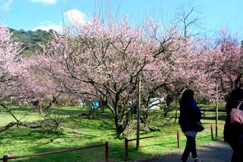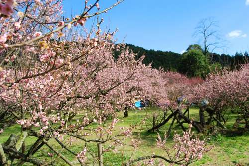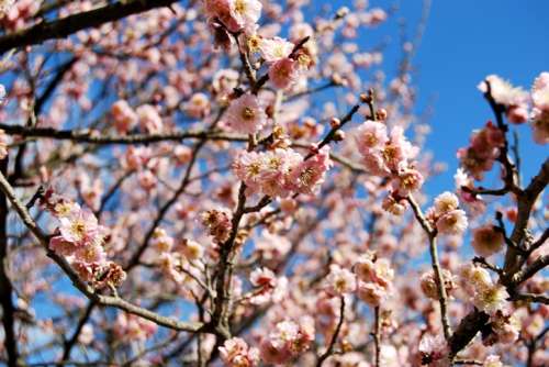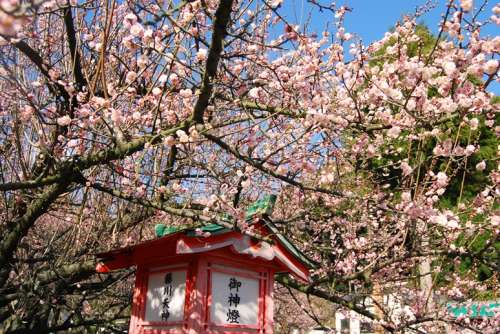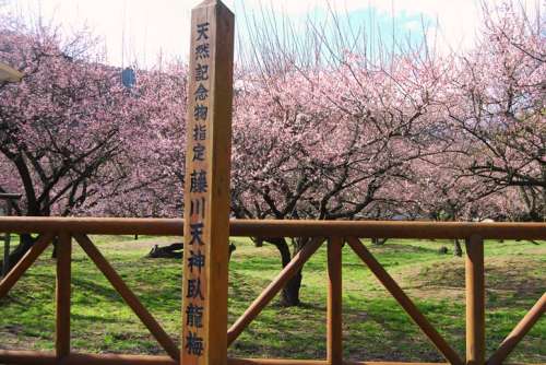 『東風(こち)吹かば 匂いおこせよ梅の花 あるじなしとて 春な忘れそ』 と、道真公が好んだ梅の花に寄せて、 都を離れ太宰府に流される折に詠んだ歌です。 福岡の太宰府天満宮の飛梅(とびうめ)伝説と同様、 この「藤川天神」にも、梅に縁があります。 境內の梅園には、 道真公がお手植えされた一株が繁茂したと言われる、 約150本の梅の木があります。 藤川天神の梅は、『臥龍梅(がりゅうばい)』と呼ばれています。 幹や枝が地を這うように広がり、 あたかも龍が地に臥(ふ)しているように見えることから その名が付いたとされています。 樹齢1000年を超えるといわれる古木もある梅園は、 薄紅色と青の空とのコントラストは春の訪れを感じさせてくれました。 道真公が植えたとされる臥龍の梅花は、 その御霊を慰めていることでしょう。