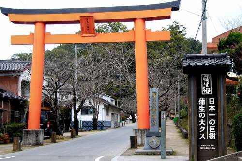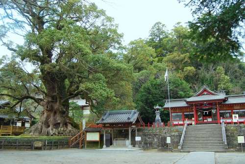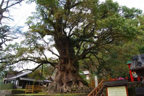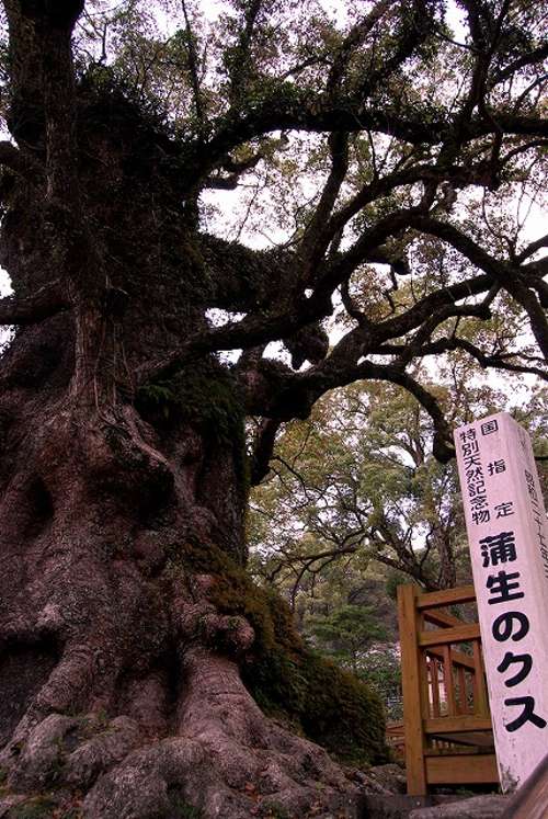 奈良時代に天皇につかえていた道鏡(どうきょう)という僧と、 貴族だった和気清麻呂公(わけのきよまろ)との間に起った 宇佐八幡宮神託事件。 これが元で大隅の地へ流された和気清麻呂公は、 蒲生の地を訪れたとされ、手にしていた杖を地に刺し、 根付いたものと伝えられているのが、「蒲生の大楠」です。 1123年(保安4年)この地の豪族、蒲生氏が「蒲生八幡神社」 を創建した時には既に神木として祀られていたともいわれます。 蒲生八幡神社社殿橫にそびえ立つ「蒲生の大楠」は、 樹齢約1,500年、根周り33.5メートル、目通り幹囲 24.22メートル、高さ約30メートルと大きな楠です。 環境省が1988年(昭和63年)と2000年(平成12年) に行った巨樹巨木林調査には、全國約68,000本の樹木 のデータベースに登録されていて、その巨木の中でも日本一です。