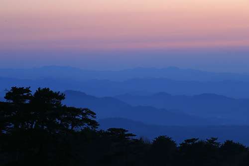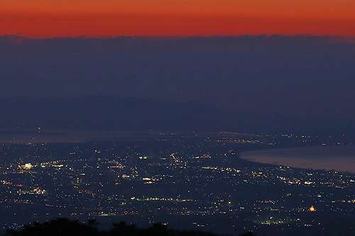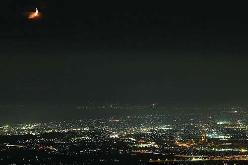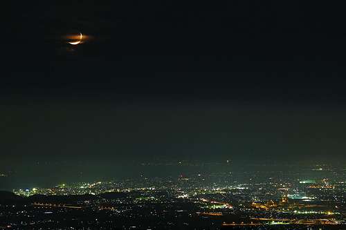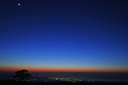 夕暮れから夜にかけての大山放牧場。 日が沈み、徐々に空が暗くなるのと同時に浮かび上がる市街地の街燈り。 その街に少しづつ三日月が沈む様子は何とも幻想的な瞬間でもありました。