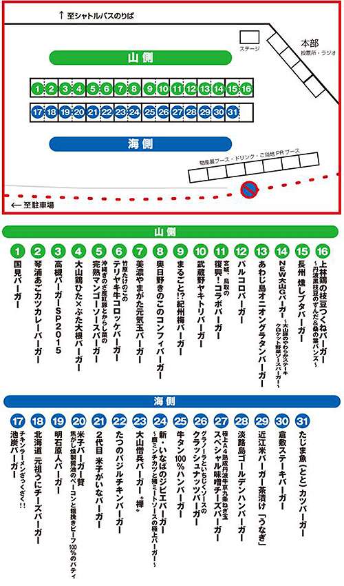 北海道から沖縄まで31団體が勢ぞろい ご當地バーガーの甲子園がいよいよ開幕! いよいよこの季節がやってきました。 秋といえば食欲の秋、そしてバーガーの秋。 「とっとりバーガーフェスタ2015 全國ご當地バーガーグランプリ」が今年もいよいよ開催間近となりましたね。 日本最大のご當地バーガーの祭典にして、ご當地バーガー日本一決定戦。 これだけのバーガーのイベントが他県で行われたことはこれまでもありません。 佐世保バーガーの聖地でもある長崎県でも同様です。まさに鳥取県だけ。 そうした意味でもこのネットワークを活用したいと特に首都圏からの開催オファーも多く、いかにこのフェスタが食のイベンターに注目されているかがわかります。 昨年、臺風による延期開催という非常事態にもかかわらず3萬人弱が來場。 そのなかで、參考記録ながら堂々グランプリを手にしたのが和歌山県?湯淺町代表「まるごと!紀州梅バーガー」。 一般票で3位だったこのバーガーが、見事の1位を手にした最大の勝因が審査員票。 審査員向けに行われるプレゼンだけでなく、地域をあげた取り組みであることが支持を集めた最大の理由と言えるのです。 とにかくその後の反響がすごかった。 すぐに地元で大々的に報道され、お店には長蛇の列。催事にひっぱりだこで、売り上げはグランプリ前の10倍以上にも膨れ上がったそうです。 バーガーフェスタがもたらす経済効果の大きさを改めて証明する形になりましたね。 さて、今年度は予選會を勝ち抜いた鳥取県10代表、沖縄の1代表を含む31団體がエントリー。 なんと、北は北海道から南は沖縄に至るまで、まさに全國大會にふさわしいバーガーがエントリーしているようです。 山側 01 福島県?國見町 「國見バーガー」 國見町商工會 02 鳥取県?琴浦町 「琴浦あごカツカレーバーガー」 あぶい蒲鉾 03 大阪府?高槻市 「高槻バーガーSP2015」 T’s★Diner(ティーズスターダイナー) 04 鳥取県?伯耆町 「大山鶏ひた×ぶた大根バーガー」 伯耆キズナバーガーズ 05 沖縄県?宜野座村 「沖縄ぎのざ産紅豚とからし菜の完熟マンゴーソースバーガー」 沖縄県宜野座村/沖縄バーガープロジェクト実行委員會 宜野座バーガー 炭焼家てんぷす 06 広島県?竹原市 「竹原たけのこバーガー」 竹原ブランド開発推進會議 07 岐阜県?山県市 「美濃やまがた元気玉バーガー」 美濃山県元気ファーム 08 鳥取県?日野町 「奧日野きのこのコンフィバーガー」 BUBNOVA×しいたつ 09 和歌山県?湯淺町 「まるごと!?紀州梅バーガー」 パン工房カワ(株式會社カワ) 10 東京都?武蔵野市 「武蔵野ヤキトリバーガー」 コックテイルハンバーガーズ 武蔵境店 11 鳥取県?伯耆町 「宮城、鳥取の復興!コラボバーガー」 ゆめ工房 12 三重県?志摩市 「パルコロバーガー」 株式會社 山﨑 13 兵庫県?南あわじ市 「あわじ島オニオングラタンバーガー」 あわじ島バーガー 淡路島オニオンキッチン(南あわじ市商工會) 14 鳥取県?伯耆町 「NEW大山Gバーガー ~大山豚のやわらかステーキ クロケット野菜ソースバーガー~」 大山Gビール ビアホフガンバリウス 15 山口県?山口市 「長州 燻しブタバーガー」 Bull's cafe 16 京都府?綾部市 「上林鶏の炭焼つくねバーガー ~ヘルシー?黒枝豆ずんだ&桑の葉バンズ!~」 綾部高校東分校×あやべ溫泉 海側 17 大阪府?池田市 「チキンラーメンざっくざく!!「池炭バーガー」」 関関COLORS×Boulangerie Antibes 18 北海道?札幌市 「うにチーズバーガー」 HAMBURGER SHOP“TACK” 19 兵庫県?明石市 「明石原人バーガー」 檜亭&とりどり 20 鳥取県?米子市 「米子バーガー贅 鳥取和牛のパティと焦がし燻製醤油のベーコン」 伯耆ノ國三ツ星食材プロジェクト 21 鳥取県?米子市 「2代目 米子がいなバーガー」 米子がいなバーガー普及実行委員會 22 兵庫県?たつの市 「たつのバジルチキンバーガー」 キッチンSANSARA(サンサーラ) 23 鳥取県?大山町 「大山僧兵バーガー禪」 伯耆ノ國大山開山1300年精進料理開発部 24 鳥取県?鳥取市 「新?いなばのジビエバーガー ~鹿ミンチカツと豬ミートソースの極上バーガー~」 いなばのジビエ推進協議會 25 靜岡県?富士市 「牛タン100%ハンバーガー」 牛タン100%ハンバーガー普及の會 26 鳥取県?南部町 「グラノーラといちじくソースのクラッシュナッツバーガー」 ノームの糸車&なんぶバーガー応援隊 27 京都府?京都市 「極上A4熟成丹波牛京九條ねぎ玉スペシャル味噌チーズバーガー」 九條ねぎバーガーマハロ 28 兵庫県?淡路市 「淡路島ゴールデンハンバーガー」 トムズスタジオ淡路夢舞臺店 (株式會社トーマス) 29 滋賀県?高島市 「近江米バーガー茶漬け「うなぎ」」 鰻彩堂(まんざいどう) 30 岡山県?倉敷市 「倉敷ステーキバーガー」 エコクラシキ 兼康家 31 兵庫県?香美町 「たじま魚(とと)カツバーガー」 「たじまのさかな」新商品?新メニューの開発推進チーム どうですこの顔ぶれ。