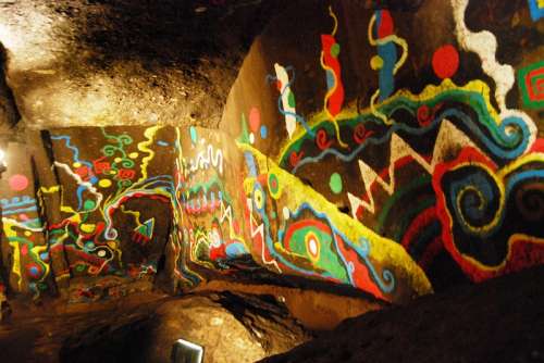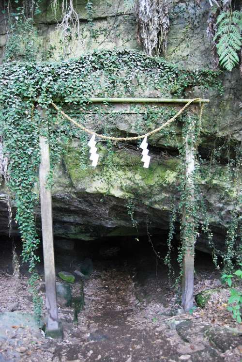 現(xiàn)在の霧島市國分平野に 古代神話で “熊襲”(くまそ) と呼ばれる 部族が住んでいました。 (後に、隼人族の祖 とも言われています) 熊のように猛々しく、勇ましい人々だったとされ、大和朝廷に抵抗し、 景行天皇の息子: 日本武尊(やまと たけるのみこと) の熊襲討伐の物語は古事記や日本書記にも登場します。 その熊襲族が住居していた穴とされる 「熊襲の穴」が、 霧島市隼人町の「妙見溫泉郷」にあります。 熊襲の首領(lǐng): 川上タケルは、 女裝した日本武尊によって殺害されました。 この時、川上タケルが息絶える直前に 日本武尊と命名したことから、一名嬢著(じょうちゃく)の穴ともいわれます。 國道223號沿いに案內(nèi)表示があって そこから山道を上って行きます。 辿り著いたのは 大きな巖肌の下に少し空間が空いた場所。 身をかがめながら巖の隙間から中に入ると、大きな空間が広がります。 奧行き22メートル、幅10メートル、高さ6メートルの広さだそうです。 壁には鹿児島県出身の 前衛(wèi)畫家:萩原貞行氏に よる古代熊襲族をイメージ した様々な図柄が描かれていて神秘的な空間です。 熊襲の住居というよりも、 神事をなど執(zhí)り行ったところではないかと感じました。