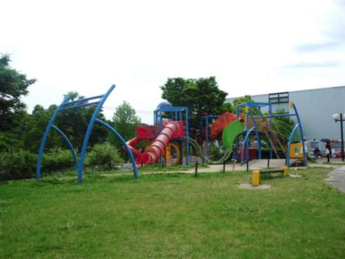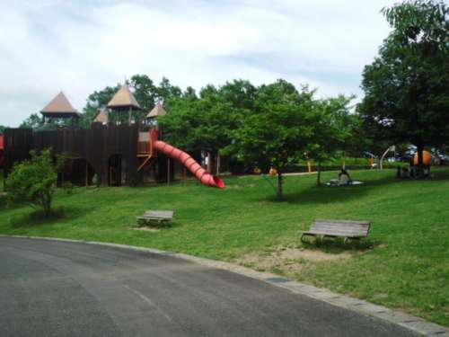 すべり臺で遊ぶ子どもたちやお弁當(dāng)を広げる家族連れ、