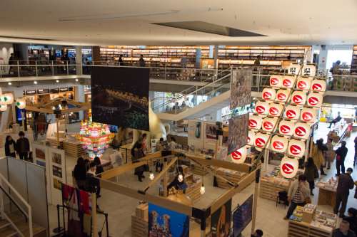 ここは、函館市石川町にある大型書店「函館蔦屋書店」。普段は建物の真ん中ににある吹き抜けスペースでさまざまな催しが行われていますが、この日は秋田県のプロモーションが行われていました。天井から下がる秋田竿燈祭りの提燈がムードを盛り上げます。