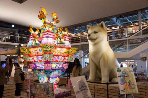 秋田県といえば誰もが思い浮かべる秋田犬。本物は來てくれませんでしたが、代わりに巨大なバルーンで登場。高さ20m以上の燈ろうが街を練り歩く能代市の七夕行事「天空の不夜城」もミニチュアで展示されました。世の中には知らない祭りがたくさんありますね。