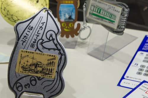 さらに展示物を見てみると、何やらイカの形をしたグッズが何種類もあります。これらは、過去に発売された記念乗車券などの臺紙。最近はみんな同じ大きさで同じ形になってしまいましたが、昔のほうがバリエーションに富んでいたようです。またこんな変わった形のきっぷが復活したら楽しいでしょうね。