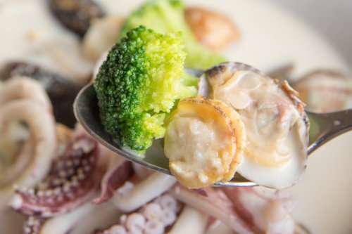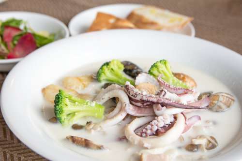 さっそく「はこだてチャウダー」をオーダー。白いスープにたっぷりと具が入っていて、見るからにおいしそう。スープを口に運ぶと、上品な魚介のうまみが広がります。