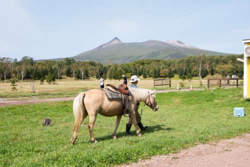 會場は、駒ケ岳を望む大沼流山牧場パド?ミュゼ。草の上を馬が歩いているだけで絵になる景色です。