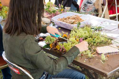 女性の人気を集めたのは、木の枝やトドマツの樹皮をベースに植物を飾り付けるリース作り體験。