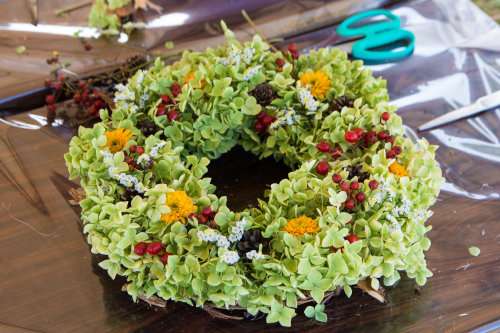 完成するととても豪華でおしゃれなリースができあがります。このほか、木の皮で布を染める體験や木製のイス作りなど、子どもも大人も楽しめる木育體験が提供されました。