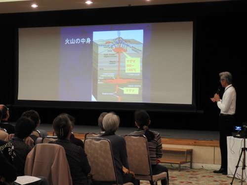 まず初めに鹿部町の防災危機管理官の徳丸様より駒ケ岳の噴火のメカニズムや鹿部町の避難體制に関する講話をしていただきました。わかりやすい資料をもとにとてもためになる話をしていただき、オーナーの皆様も真剣に耳を傾けていらっしゃいました。