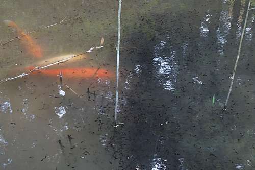 駐車場に車を停め、黃泉比良坂へ向かう途中には 濁った池があり、鯉が泳いでいたのですが、 その近くに何やら黒い物體が。
