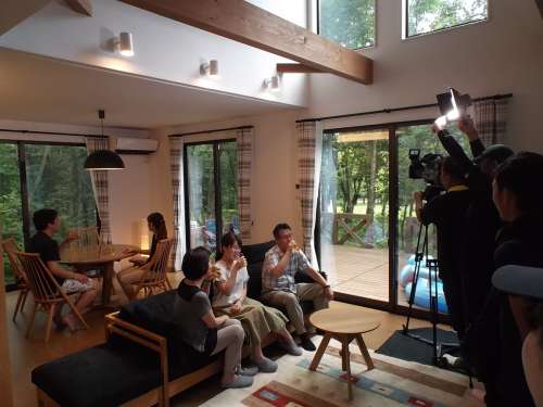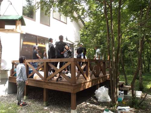 俳優の中本賢さんが、別荘での楽しみをご紹介。 昨年別荘を建築されたK様ご家族と一緒に大山の魅力を再発見! 広々とした気持ちの良いウッドデッキでの撮影の様子。