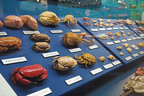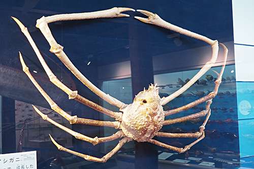 境港でよく水揚げされる「ズワイガニ」をはじめ、 名前を聞いたこともないカニまで、 様々な種類が展示されていますが、 特に目を引くのが世界最大のカニ 「タカアシガニ」。