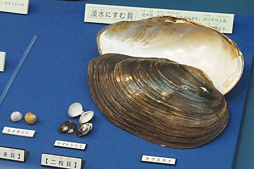 貝のコーナーには、 巨大な二枚貝の 「カラスガイ」がありました。