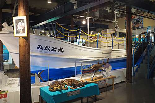 館內中央には実際に使用されていた 漁船がドーンとあり、 実際に船の上に乗ってみることもできます。