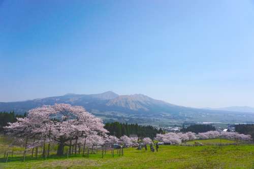 牧野を歩いて登り、外輪山側から望むと、阿蘇五岳を背に見事な枝を広げる桜を観賞できますよ。
