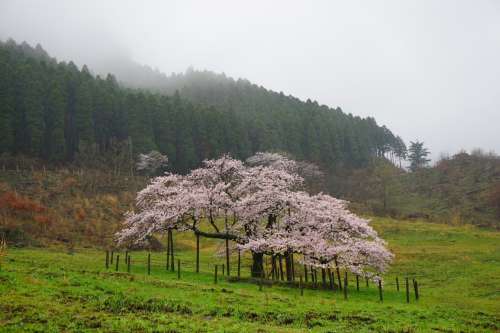 県道28號線の脇道沿いにある牧野に立っており、開花時期のみ桜に近付くことができます。全國的に有名な「一心行の大桜」に比べると観光客は少なめで、時間をかけての寫真撮影も可能。
