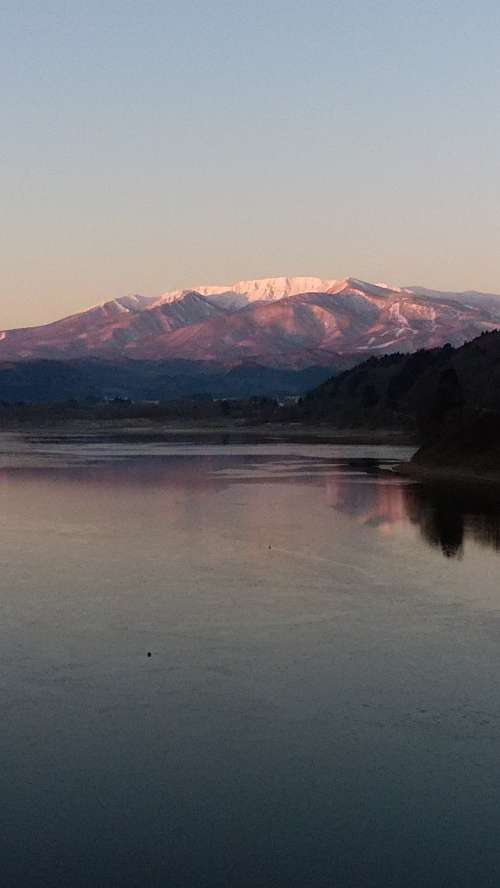 蔵王へ向かう途中のダム湖、釜房湖からの蔵王遠景。