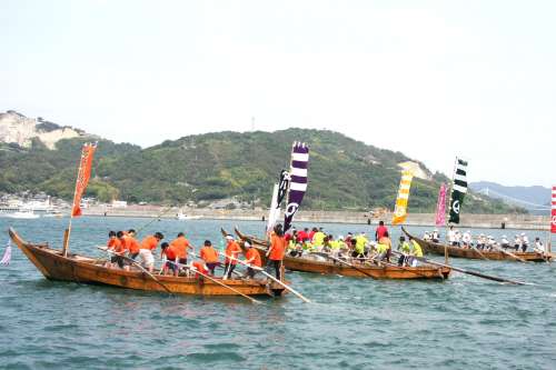 水軍レース大會は約50年前まで伝統(tǒng)行事として行われていた 「押し船競爭」が由來となっていて、木造の小早船に12人が乗り込み、 1人が合図を出し、10人が漕ぎ、1人が身竿を擔當します。
