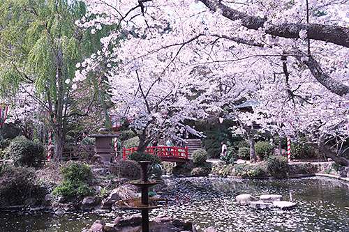 公園の入口すぐには、打吹山に殘る天女伝説に 因んでその名が付いたという「羽衣池」があり、 池にかかる赤い橋と桜が織りなす美しい景色に、 多くの人が足を止め魅了されているようでした。