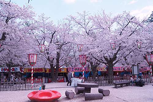 桜の回廊を歩いていくと、 屋臺が並ぶ賑やかなエリアがありました。
