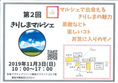 11月3日(日曜日)に「きりしま マルシェ」が開催されました。 昨年の出店舗數は約50店でしたが、今回は約倍の109店舗が出店しました。 遊びに來られるお客様が多いことから、當社グループの「Active RESORS霧島(ホテル)」の西館駐車場と観光バス置き場の広場も解放しご利用頂きました。 朝の早い時間にも関わらず、駐車場は満車に近い狀態となりました。 今年も天候に恵まれ、時間を追うごとに來場されるお客様が多くなり會場は大変な賑わいでした。 霧島高千穂リゾートランド(高原の別荘地)のオーナー様も遊びにお越しになられていました。 これからも、毎年の恒例行事の一つとして開催されることでしょう。 また、この日は、鹿児島県內の各地で沢山のお祭りやイベントが開催されていました。鹿児島市內では「南九州最大のお祭り?おはら祭り」も開催されていました。