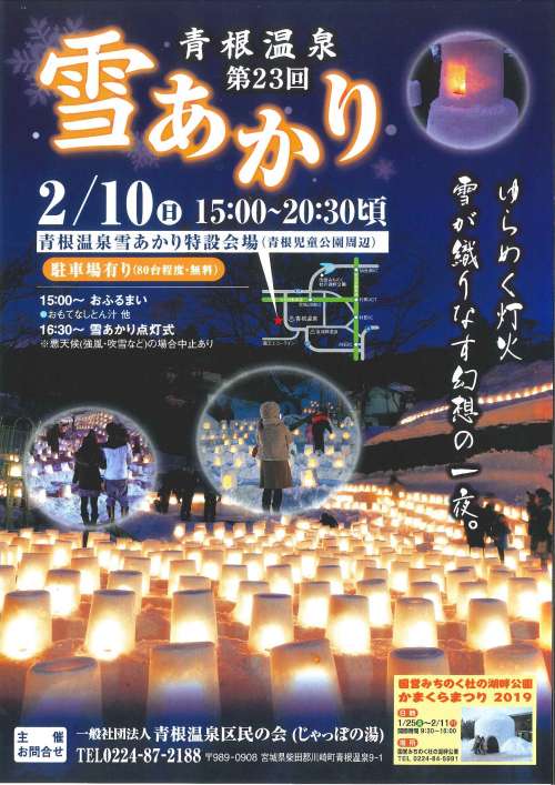 今年も青根溫泉の冬の風物詩「青根溫泉 雪あかり」が開催されます。 「青根溫泉 雪あかり」は、約2000本のロウソクの光と雪燈籠の冬景色が美しい観光イベントで、地元住民や子どもたちが手造りで小さなかかまくらを作り中にロウソクを燈す、心溫まる雪まつりとなっています。