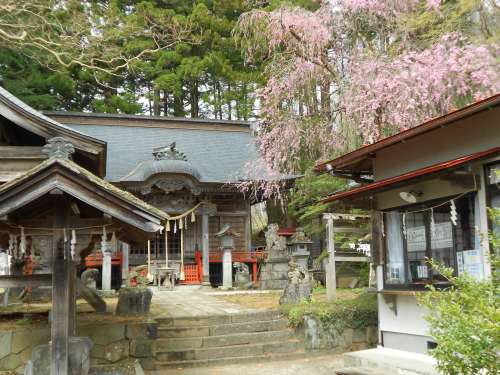 こちらは、蔵王町遠刈田溫泉街に鎮座する、刈田嶺神社里宮內の桜です。 神社の靜かな佇まいの中、厳かさは感じるけれど、色彩的にはちょっと地味な印象の境內。 枝垂れ桜が濃いピンクの花を咲かせることにより、一転、華やかになりました。