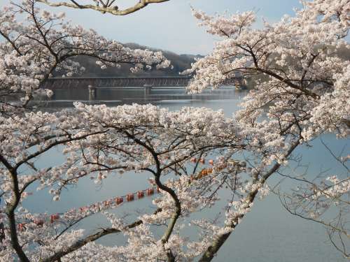 おなじみの、川崎町釜房湖の桜です。 桜の向こうに橋が見えますが、仙臺と蔵王の行き帰りには、いつもこの橋を渡ります。 ここの湖はダム湖ですが、湖の外周に沿って、たくさんの桜が植えられており、観光客の目を楽しませています。