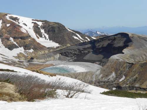 今の時期しか見られない、殘雪に囲まれた凍ったお釜を眺めて、歓聲を上げる姿が、そこかしこで見られました。