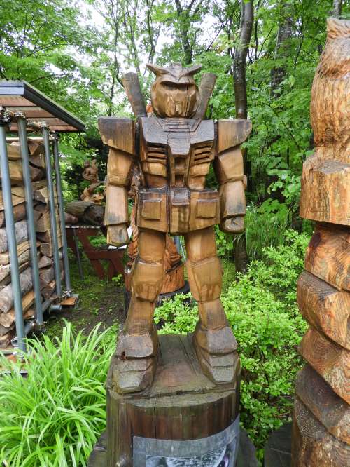 さて、こちらは言わずと知れた、あのキャラクターが題材の「木彫りのガンダム」です。この日は雨がやんでおらず、「ざおうさま」も「木彫のガンダム」も雨に濡れて寂しげでした。