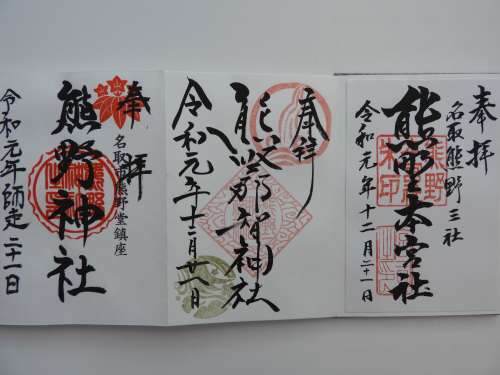 伊勢?熊野の旅で御朱印をいただくことに目覚めたワタクシは、當然といえば當然のごとく、今回も三神社の參拝後に御朱印をいただいてまいりました。 左から、熊野神社、熊野那智神社、熊野本宮神社の御朱印です。三神社の御朱印を見るにつけ、紀伊熊野三大社にお參りしたにもかかわらず、御朱印をいただいてこなかったのが、殘念至極でなりません。それでも、こんなに近くで熊野詣ができるなんて、ウン十年も宮城県に住んでおりながら、全くもってウカツなことです。蔵王からは約30km、仙臺に向かう途中ですから、気軽にお參りに來ることができます。 今回のテーマは、蔵王の話題からちょっと離れてしまいまして、申し訳ありません。それでも年の瀬にあたり、元気に年を越せることに感謝し、併せて、來る新しい令和2年のみなさまの息災を、三神社の神々にお願いしてきましたということで、どうぞご容赦くださいませ。 ※熊野本宮大社(名取市高舘熊野堂五反田34):當リゾートより約34km ※熊野那智神社(名取市高舘吉田舘山8):當リゾートより約38km ※熊野神社(名取市高舘熊野堂巖口上51):當リゾートより約34km 寫真は令和元年12月撮影