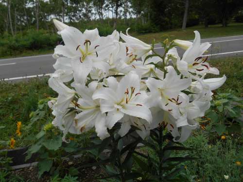 前回のひまわりに引き続き咲いたのは… カサブランカです 大輪の白い花が大迫力ですね 花壇のいいアクセントになっています 寫真は令和元年8月に鹿部販売管理事務(wù)所にて撮影