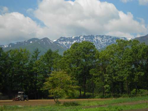 ぼみに殘る雪は、まもなく消えてしまいます。初夏の蔵王を背景に農作業も始まりました。全く、この風景は絵葉書のようでしょう?