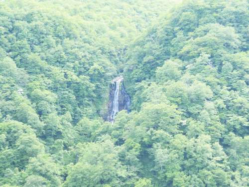 緑は濃さと繁りを増して、山はすでに夏の顔となっています。木々たちがもっと頑張れば、滝も隠れてしまうんじゃないかと心配になるほどの、豊かな森の景色です。滝から流れ落ちる水の、なんと涼しげなこと!