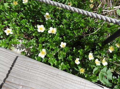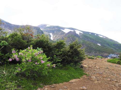 この日、お花畑で目についた花は、チングルマ、イワカガミ、そしてワタスゲです。一番目立っていたのはこのワタスゲでしょう。數も多いし比較的背も高く、何よりも目立つ形狀をしています。それが花言葉通りに風に揺れて色こそ派手さはありませんが、ずいぶん目立っていました。この日は平日でしたが、外出自粛も解除されてましたから予想以上の観光客が訪れており、お花畑內の木道はけっこう混み合っていました。