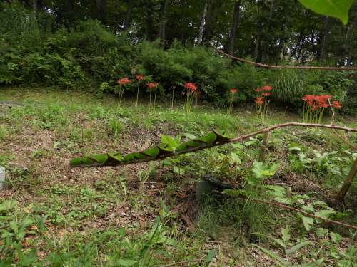 蔵王の我が家から道路の方向を眺めてみると、咲き始めた彼岸花が見えます。お彼岸になるのをわかっているかのように、この時期になると必ず花を咲かせます。