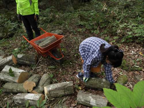 山の木というものは、病気や蟲の害などによって枯れることが、素人が考える以上に多いそうです。我が家の林の中にもそんな枯れた木があり、夫が伐採しておりました。以前に薪運びのお手伝いをしていた孫たちは、今回、丸太運びのお手伝いに挑戦です。短くカットされているとはいえ、かなりの重さがあります。孫たちには、予想以上の重労働だったようで、掛け聲をかけながら頑張って運んでいました。頑張ったごほうびに、じいじから「特別報酬」を得ていたようです。