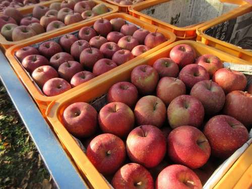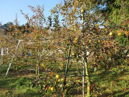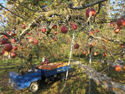 ■果樹園內ではフジ等のりんごも収穫の時期を迎え、夜空の星のようにりんごが一面赤く実を付けています