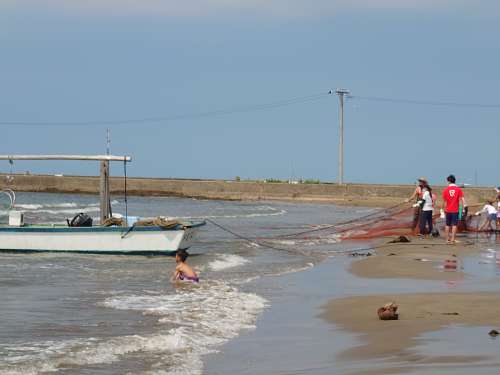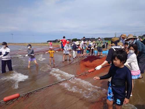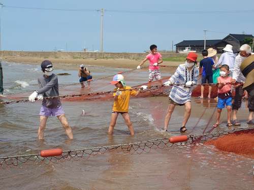 網元さんが船で網を仕掛けてくれ、皆さんの力を合わせて引き上げます
