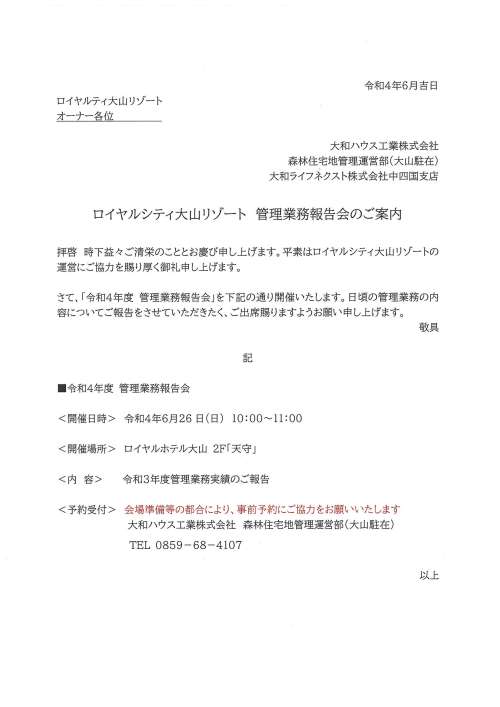 管理業務報告會 ロイヤルホテル大山2階『天守』