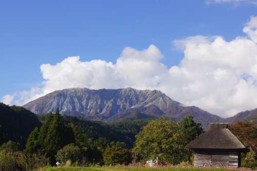 小屋の前にはコスモスが咲いており、背景は大山南壁で