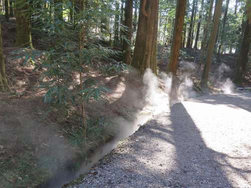 立上っています。近くに行くと強い硫黃臭と湯の花がありました。霧島神宮の