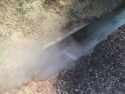 硫黃の匂いが漂ってくるではありませんか。周囲を観察すると側溝から湯気が