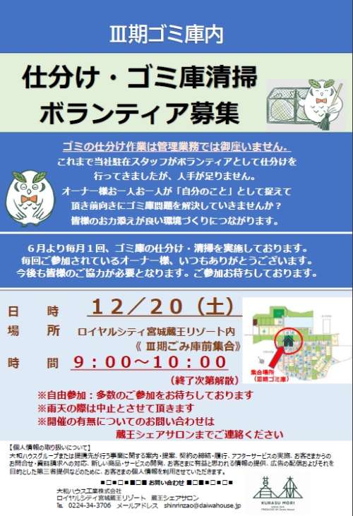 皆様こんにちは 毎月1回分譲地ごとに仕分け?清掃を行っております。 毎回ご參加いただいているオーナー様ありがとうございます 今後も皆様のご協力が必要となります。 皆様のご參加お待ちしております ■□■□お問い合わせ■□■□ ロイヤルシティ宮城蔵王リゾート 蔵王シェアサロン TEL?。埃玻玻矗常矗常罚埃?/p>