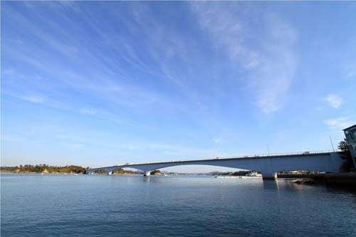 車(chē)を走らせ橋を渡ると、眼下に広がる藍(lán)色の海に浮かぶ大小の島々を見(jiàn)ることができます