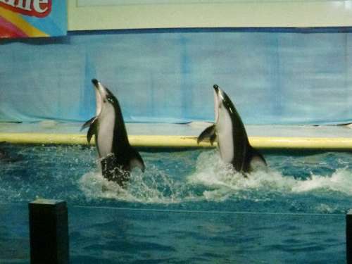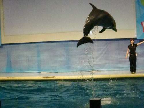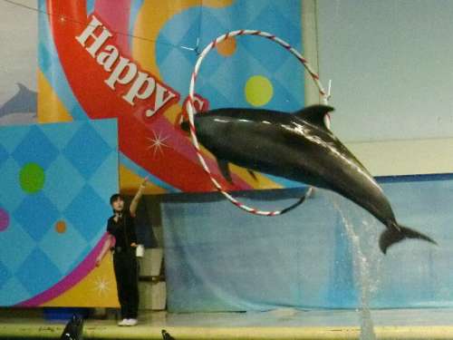 調(diào)教師の女性の合図に合わせて、ものすごい勢いでイルカがジャンプしたり環(huán)をくぐったりします