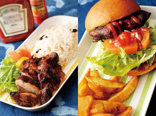 おすすめメニューは「ジャークチキン」鶏肉をハーブやスパイスに漬け込み、炭火で焼いたジャマイカの家庭料理で、同店ではナツメグやオールスパイスなどの17種類のスパイスを使用しているそうです。現地では、ハーブとスパイスのブレンドが各家庭によって異なり、それぞれ「おふくろの味」として受け継がれているようです