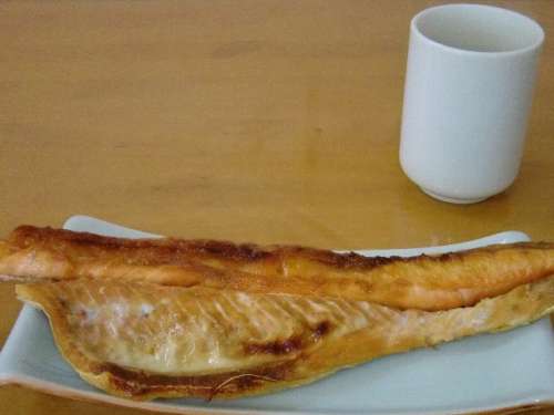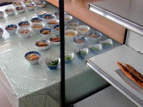 待っている間にふと見ると、カウンター近くに小鉢が“どれでも一つ50円“とあります、又近くのカウンターの鮭の「はらす焼き」100円に目が止まりここも少し贅沢して「はらす焼き」を選びテーブルで食します